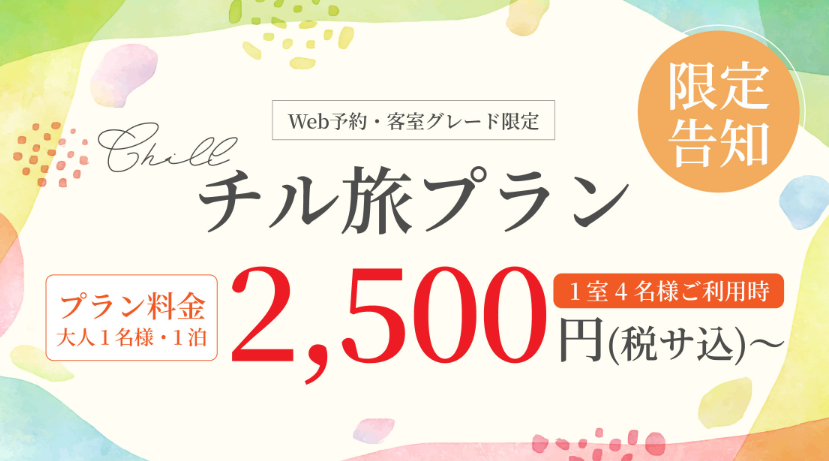 プラン料金にプラス 8,300円(税サ込)で、ご夕食時にチル旅プラン専用メニュー、